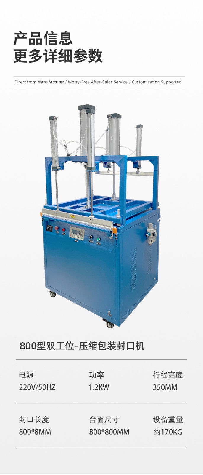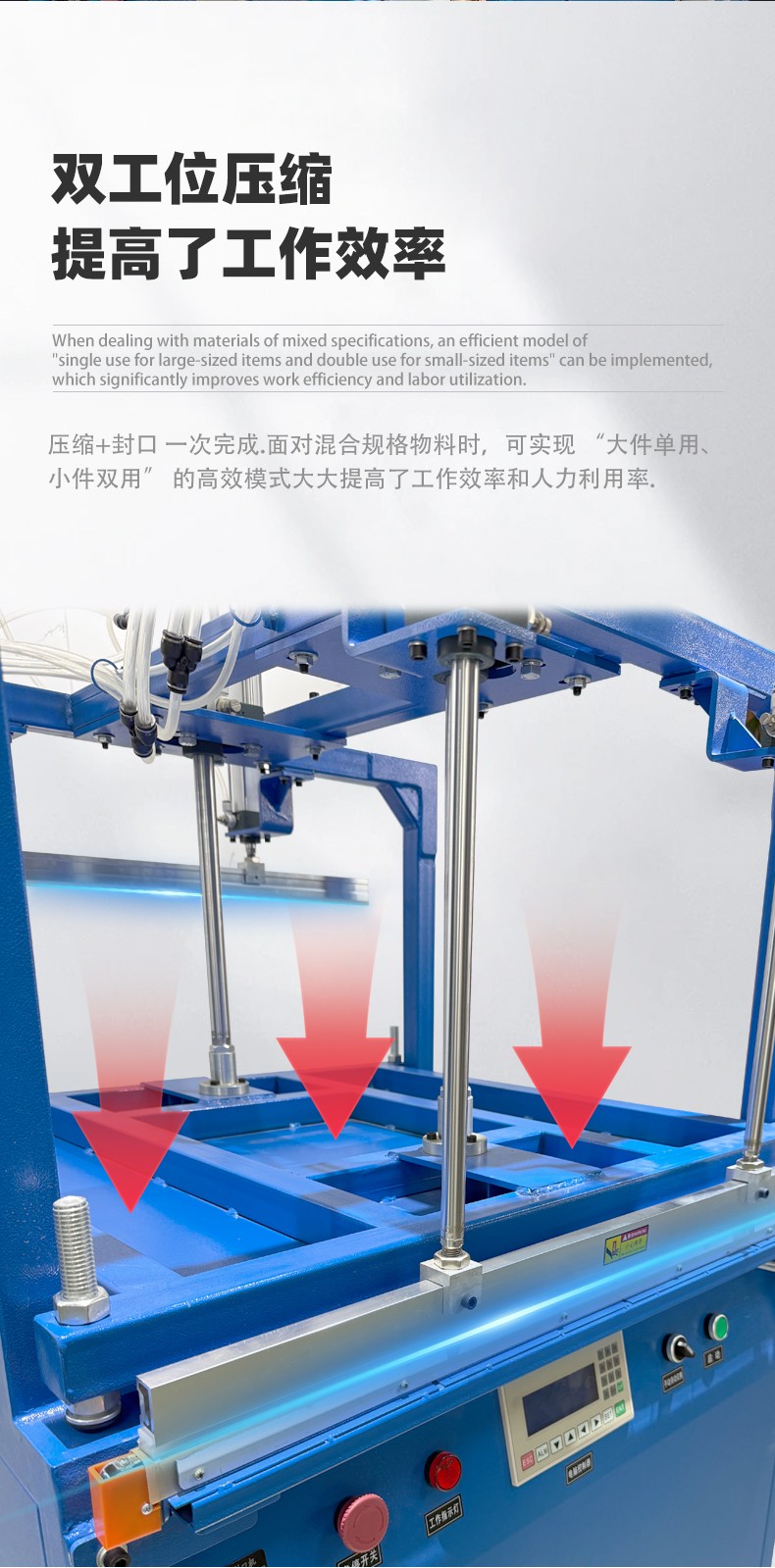 雙工位壓縮封口機(jī):兩個(gè)工位可同時(shí)作業(yè),一邊封口時(shí)另一個(gè)可放件 / 取件,適合中小批量、多規(guī)格產(chǎn)品(如多口味食品、電子元件袋),效率比單工位高 50%-80%。